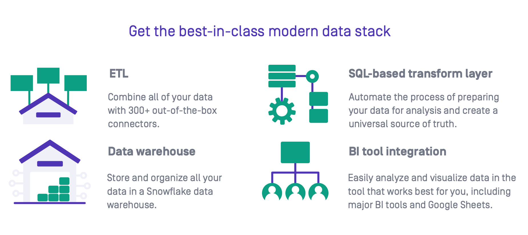 Once you create the framework for your data strategy, it’s time to set up your modern data stack. It’s best to think of it as an integrated platform instead of having separate parts. We’ve seen businesses do the latter — starting with one component and then filling in the gaps as they go — and it causes them to stumble through their data journey. Perhaps they learn about the value of a data warehouse and set up an account with Snowflake. Later they realize they need a good way to get data into their warehouse, so they reach out to Fivetran. Then they realize they need a transformation layer between their data warehouse and business intelligence tool to improve data quality and workflow efficiency. This piecemeal approach won’t save money and is slower to set up than creating an integrated modern data stack at the start.